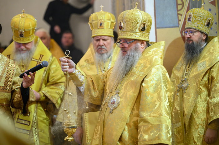Его Высокопреосвященству сослужили: митрополит Хабаровский и Приамурский Артемий, митрополит Сыктывкарский и Коми-Зырянский Филипп, митрополит Самарский и Новокуйбышевский Феодосий, митрополит Астраханский и Камызякский Никон, митрополит Владивостокский и Приморский Павел, митрополит Екатеринодарский и Кубанский Василий, архиепископ Карагандинский и Шахтинский Севастиан, архиепископ Салехардский и Ново-Уренгойский Николай, архиепископ Анадырский и Чукотский Ипатий, епископ Рыбинский и Романово-Борисоглебский Вениамин, епископ Арсеньевский и Дальнегорский Гурий, епископ Биробиджанский и Кульдурский Лука, епископ Кинешемский и Палехский Иларион, епископ Югорский и Няганский Михаил, епископ Шуйский и Тейковский Иоанн, епископ Николаевский и Богородский Иннокентий, епископ Чимкентский и Туркестанский Хрисанф, викарий Салехардской епархии епископ Ноябрьский Феодосий, епископ Кудымкарский и Верещагинский Петр, епископ Нерчинский и Краснокаменский Макарий, епископ Великолукский и Невельский Варнава.