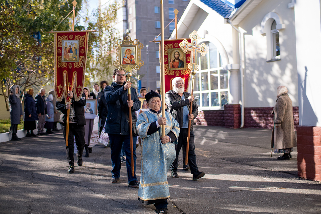 После заамвонной молитвы состоялось славление перед иконой Покрова Пресвятой Богородицы. Далее был совершен крестный ход, на котором архиепископ Севастиан окропил всех верующих святой водой. В завершение богослужения правящий архиерей обратился к присутствующим со словом проповеди, поздравил настоятеля и прихожан с престольным праздником и преподал Божие благословение.
