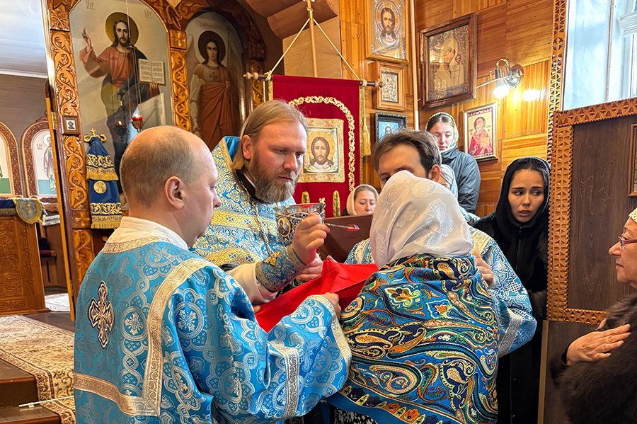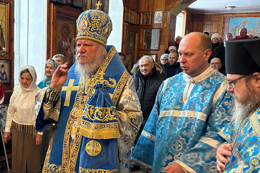 После заамвонной молитвы состоялось славление Божией Матери перед Ее честной иконой. Далее был совершен крестный ход, на котором архиепископ Севастиан окропил всех святой водой. В завершение богослужения правящий архиерей произнес проповедь, поздравил настоятеля и прихожан с престольным праздником и преподал всем Божие благословение.