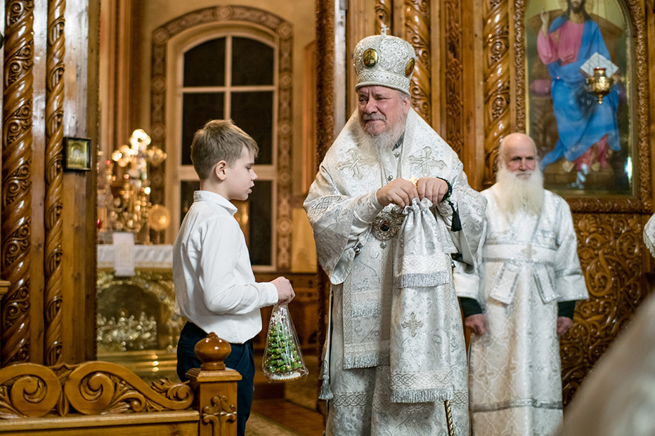 По окончании Литургии архиепископа Севастиана с Рождеством Христовым поздравили воспитанники воскресной школы. В свою очередь владыка подарил каждому сладкий подарок. В завершение праздничного богослужения правящий архиерей поздравил всех с Рождением Богомладенца Христа и преподал архипастырское благословение.